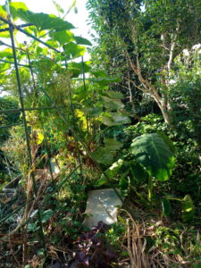 右: インゲンの蔓を解いていたら、見つけました。失敗した種イモのシルクスイートから葉が沢山出ていました。