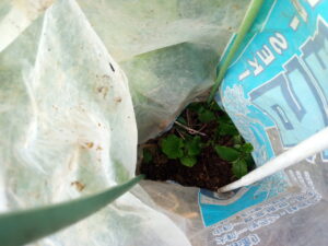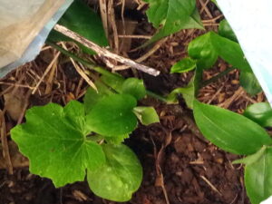 下段右: 昨日定植した南瓜。新たな葉が出たら茶殻を入れましょう。