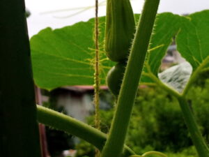 右: 脇の通路のゴーヤに二度目の花が着きました。前回は結実しなかったのです。