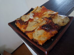 大好きな三方ヶ原のお芋と特別栽培玉葱を使って作りました。スライサーで薄くして片栗粉を塗して、半分を玉子焼き器とかフライパンで大匙1くらいの油で焼いてチーズを載せて、二回目のジャガイモには残っていた玉葱を1/4個足しました。普段は玉葱を入れると甘くなり過ぎて好きではないけれど、この玉葱は美味しいから加えました。