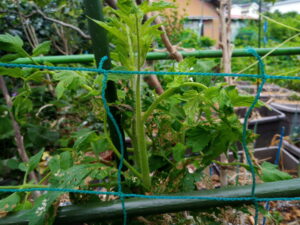 種から育てた強力米寿が氣温が上がって来たら、1mを越えて茎もじわじわと太くなりました。垂直仕立て栽培の効果でしょうか。いつも大玉トマトは梅雨明けからグングンと育ちます。以前、購入苗でしたが、13段まで収穫できた事があります。