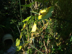 紐で誘引されて不安定な態勢の南瓜さんですが、本当にお疲れ様です。どんなにグッタリしても氣温が下がるとウソのようにシャキッとして呉れます。その度に軟な同情心で水遣りをしなくて良かった、といつも思います。今までだったら水遣りをしてしまっていたでしょう。