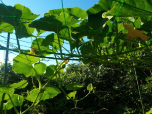 紐で誘引されて不安定な態勢の南瓜さんですが、本当にお疲れ様です。どんなにグッタリしても氣温が下がるとウソのようにシャキッとして呉れます。その度に軟な同情心で水遣りをしなくて良かった、といつも思います。今までだったら水遣りをしてしまっていたでしょう。