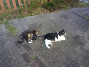 うめがカリカリを食べに来ましたが、福を探しに行っている間にうめは表に出て来てしまいました。福は呼んだけど、半分拗ねて車の下に隠れてしまいました。まぁ、後は本猫の意志です。