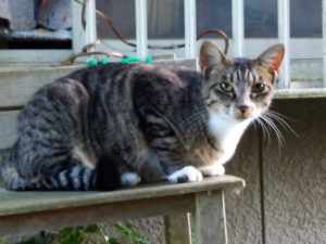 今、居る福のため、私のお昼のため、お隣から頂いた鯖を焼いています。良い匂いが感じられるらしくて福の鳴き声が甘えを帯びて止まりません。笑 後で食料品を買いに行きますが、その時に福やトラ子が居る、と言う保証はありませんから。11時半、福が出かけて行きました。サバは油が強いから少しだけ、一階猫さん達にもお裾分けです。