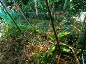 茗荷の根本に籾殻敷いて、米糠、籾殻、珈琲滓、茶殻を発酵させたものをパラパラしておこう。