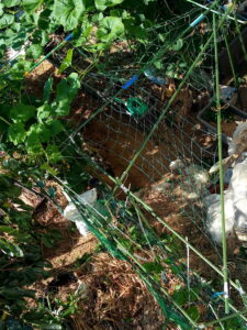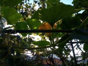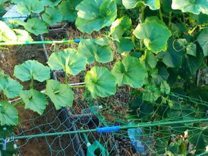 左: ようやく拡張したネット。写真は昨日の夕方に撮影。今朝は既に南瓜が進んで来ています。