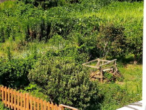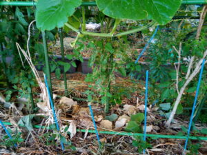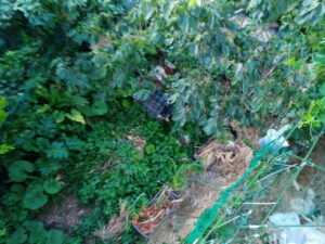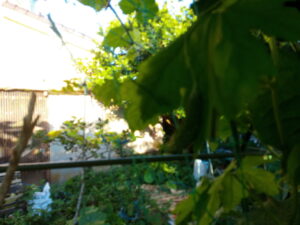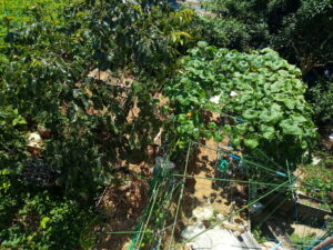 右: 10時でこんなにシオシオしています。今が一番太陽が高い位置に入る処です。南瓜の棚の下にも光が入っています。コーヒー滓が乾いて嬉しい。乾いたらあのままスコップで掬って柿の木や里芋、サツマイモ、夏野菜の根本にパラパラしてしまおう。