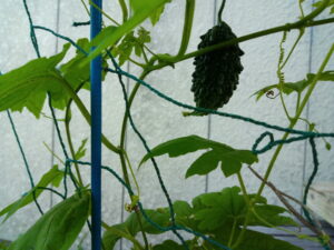 左: 中央やや下に一畝のゴーヤの実が出来ています。4-5㎝かな。