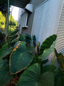 中: 連日の日照りで里芋さんが苦しそう。でも、此処で水を上げると毎日水呉れ~!が始まっちゃう。そして薄味の里芋が出来上がってしまいます。
