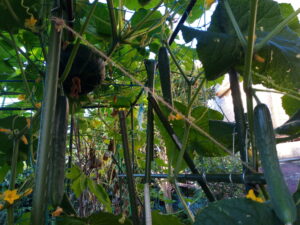 右: 一畝の胡瓜、夏涼み。支柱の影と上からと合計3本が生っています。後で一番大きいものは収穫します。