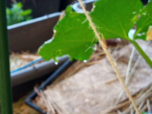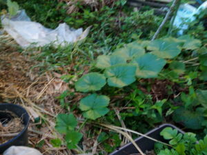 南瓜がメインですが右下の一寸形の違う葉っぱは胡瓜です。