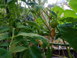 左: 脇の通路のゴーヤが4-5㎝になって来ました。