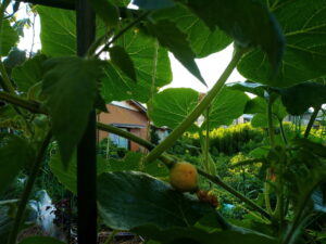 南瓜として受粉で来ても南瓜さんが育てられる能力は限られていますから、選果が始まります。残るものは緑色。落ちるものはオレンジ色に変わります。