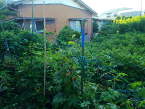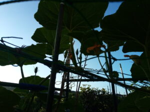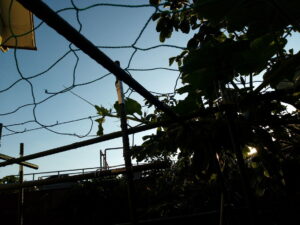 右: 既に蔓が左端で新しいネットに届いています。ゴーヤに胡瓜に南瓜がスタートの前の姿勢に入りました。一氣に来るんじゃないかな。