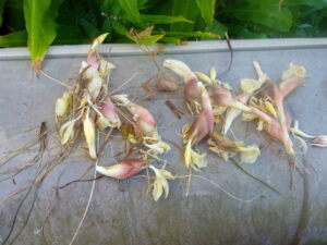 左: 茗荷を収穫しました。後は明日、でいつも失敗する。消えてしまうんですよ。