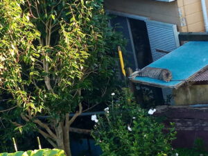お隣の物置小屋の中で唸り声が聞こえたので、水鉄砲を片手に出かけましたが、私の声を聴いた途端に黙ってしまった。という事は私の知り合いの猫ですね。