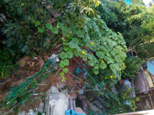 右: トマトも南瓜も絡み合って凄い状態です。大玉トマト、ジャガイモも麻紐を結わえ直しました。