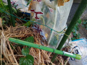 中: 一畝の胡瓜の根本には黄色になってまさに黄瓜!スープにすると美味しい、太い胡瓜が転がっていました。