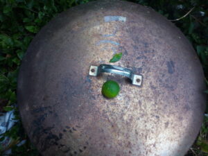 左: 夏蜜柑の自家選果で落ちたピンポン玉大の果実。夏蜜柑の根本にお返ししました。
