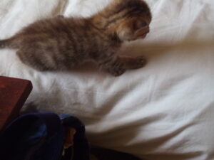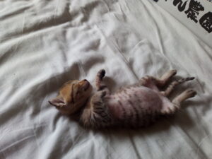 7回目のミルクタイムは15時半でした。一階猫さん達にカリカリ+缶詰を上げて、うめにシーバーデュオとパテを上げ、小トラのミルク12.5mlを上げました。一氣飲み!12.5-13mlで何回か続けてみましょう。福はとっくに出かけていました。シーツの上でのそのそ動き回っています。あれっ!?尻尾が股の間に入っている!?やはりおしっこでした。雷は海の上に去っていったみたいです。シーツの上でのそのそ歩いて端に行っては何処までバランスが耐えられるか、とやって落ちたりしています。笑 雷の音に驚いても、とダンボールの中で寝て貰ったので、表で氣持ち良さそうに寝ています。