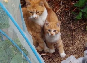 赤トラ君が戻って来ない…。親たちは暑さでダウン。赤トラ君が14時前に帰って来ました。良かった、良かった、と仔猫用のパウチを丸まる一袋上げました。クロスケがお相伴。得したね。もう、赤トラ君、心配させないでね。さっき三毛ちゃんも一袋丸まる食べたし。得しちゃったね。