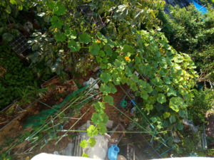 右: 二畝の南瓜さんの花?がまた咲き始めています。一畝の南瓜さんの果実が後二個蔓が上がるのを待っています。