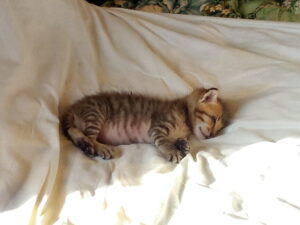 三回目のミルクタイムは8時に15mlでした。15mlを飲ませました。お腹ポンポコリン!の小トラです。シーツの上が日陰になりましたので、おしっこケアをしてから運動会させます。