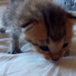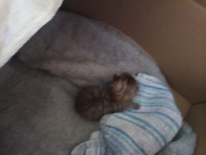7月19日に拾って、猫だけど全然😸という感じじゃなくてそれでも2時間おきにミルクを必要としていておしっこも一人ではできず、ミルクのみ人形みたいに飲んだら、直ぐにおしっこ。眼がようやく開いたばかりで生後一週間くらいだったのでしょう。ミルクとおしっこ…そんな繰り返しが、いろいろとミルクが足らない、とか文句を言うようになり、シャコタンでシーツの上を歩き始めて、少しずつ筋肉らしいものがついて来て今では四肢は確りと胴体を支えるまでになりました。今ではベッドから降りたのか、落ちたのか、床に居る時もあります。7月19日の前日にあんなにおおきな声でお隣と我が家の間の茗荷畑で鳴いていたのに、家では蚊の鳴くような声しか出しません。アノ時は命が掛かっていたんですね。炎天下で鳴いていた仔が居ない、と思ったら、日陰に這って行って沈黙。カラスが上空を飛んでいるし、観ていられなくてぐったりした身体を持ち上げた途端、大きな声で鳴きました。