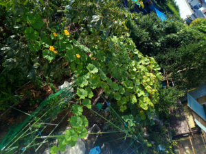 左: 一畝の南瓜さんがお隣の建物を目指していましたが、ついに届きそうです。