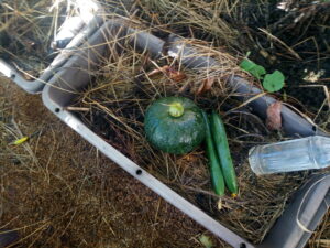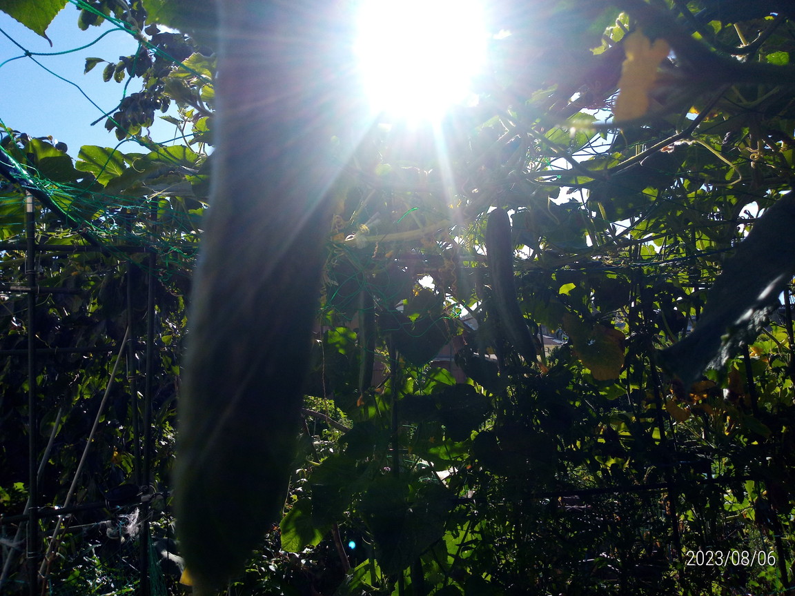 右: 一畝の南瓜の果実は少し早いけれど、木が持たないから早めに一つだけ収穫しました。胡瓜は二本+追加が一本でした。来年は5-6株植えたいですね。