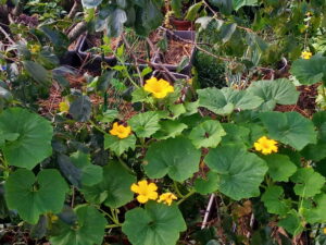 右: いずれも二畝の南瓜さんですが、先頭は椿の木を目指している!?