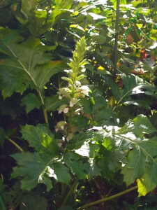 右: アカンサスの花穂。我が家では初めて植えた株です。二本目の花で高さは40-50㎝ですが、古い株では1m位の背丈になるみたいです。