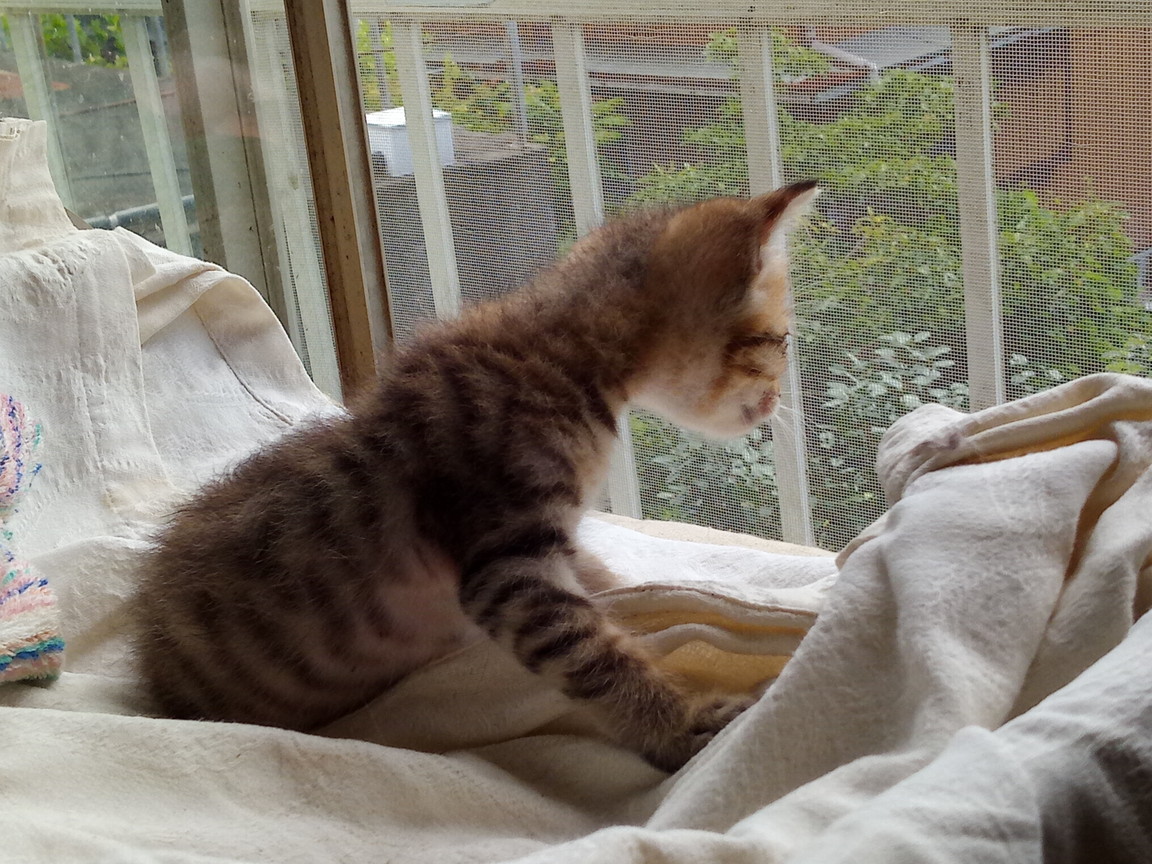 初めてお外の世界を見た小トラにとっては鳥瞰図的に見えたのでしょうか!?興味津々で見ていました。下から見る世界はまた違うんだよ。これからいくらでも見られるよ。